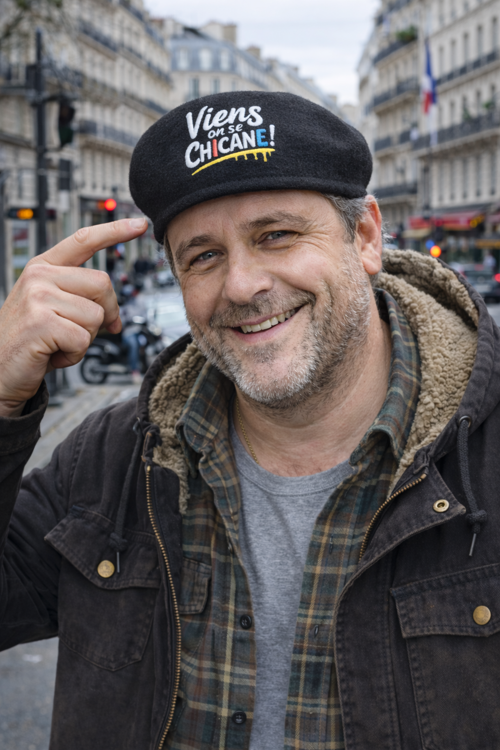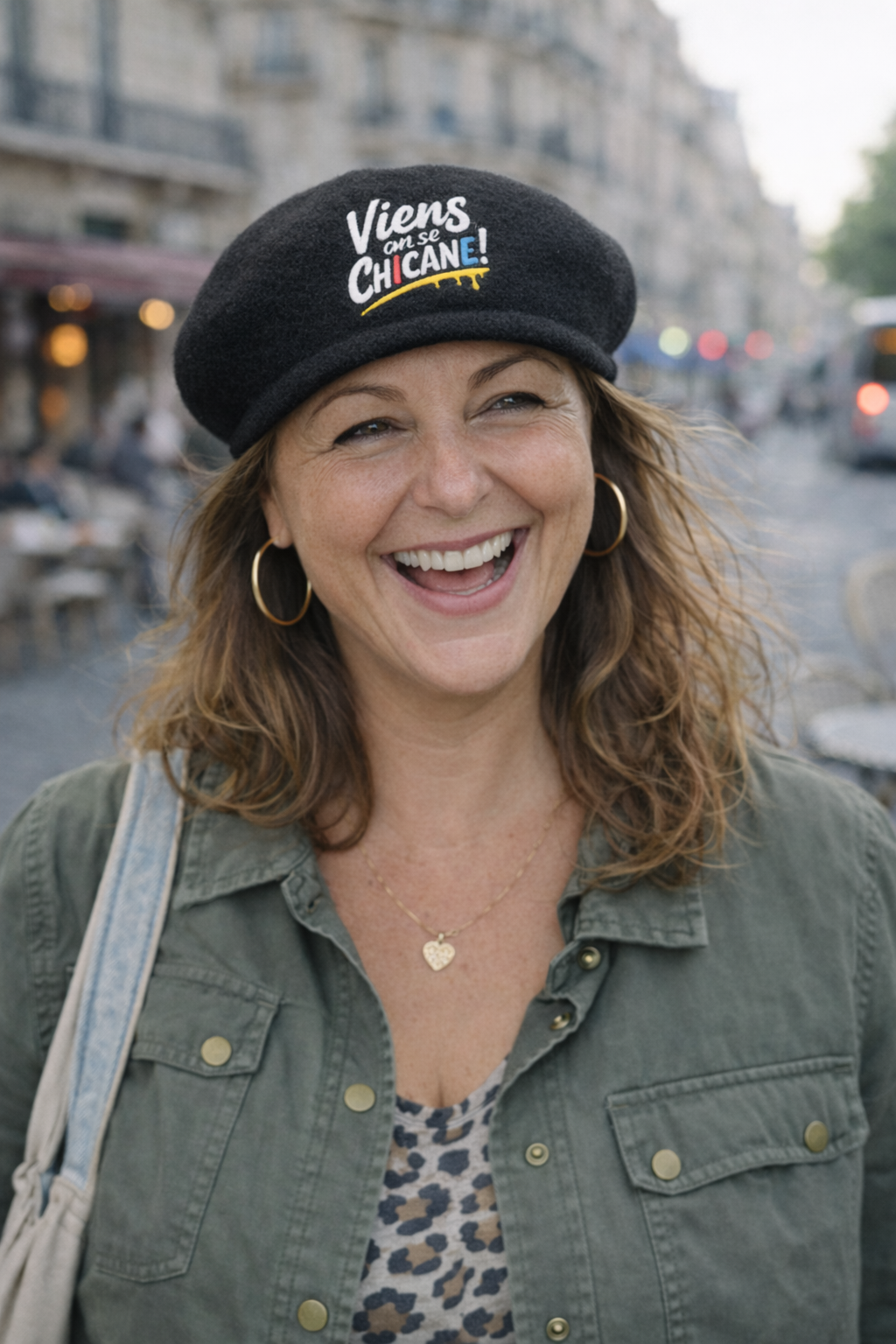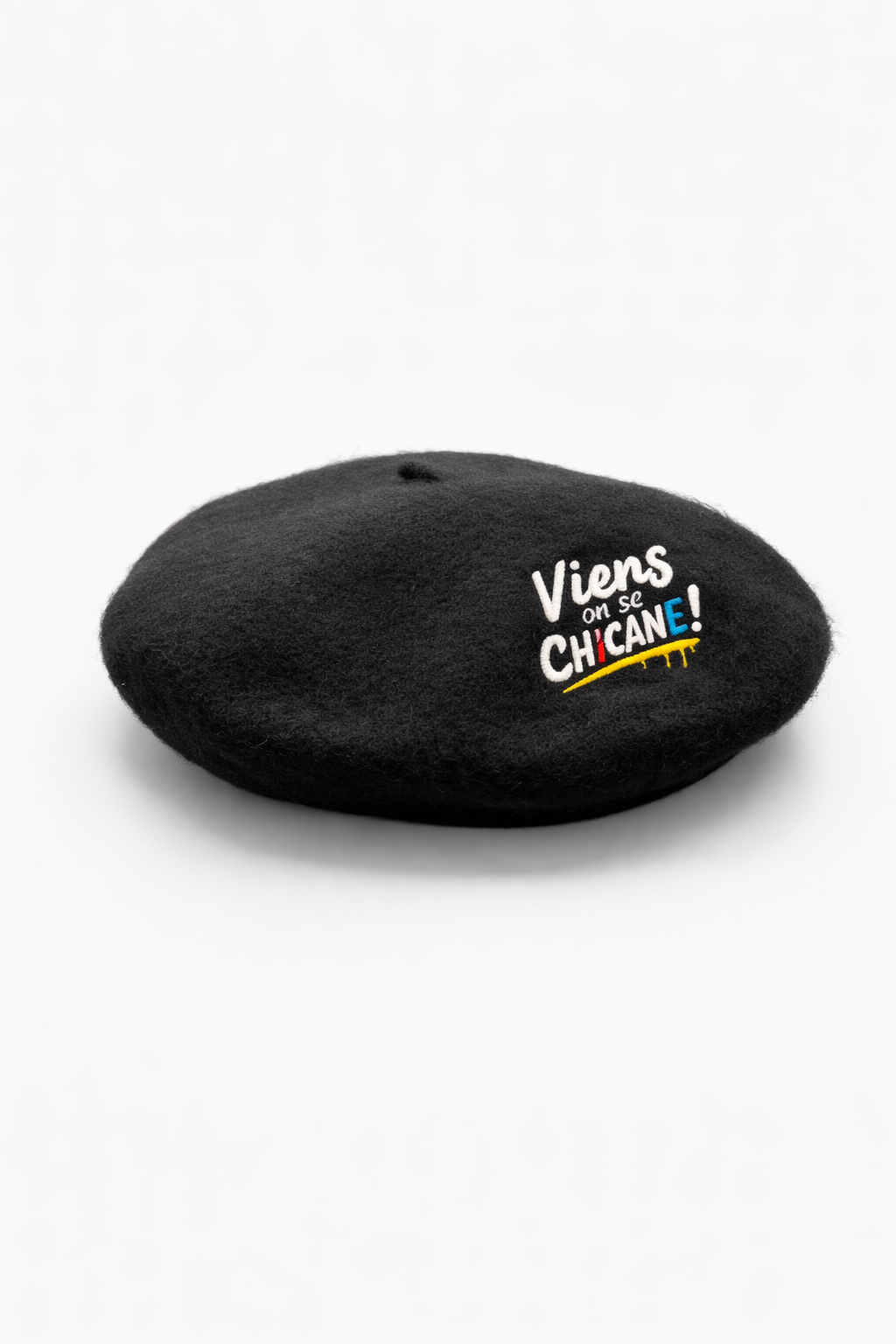Béret noir en laine, brodé du slogan coloré « Viens on se chicane ! », au style fun et audacieux.